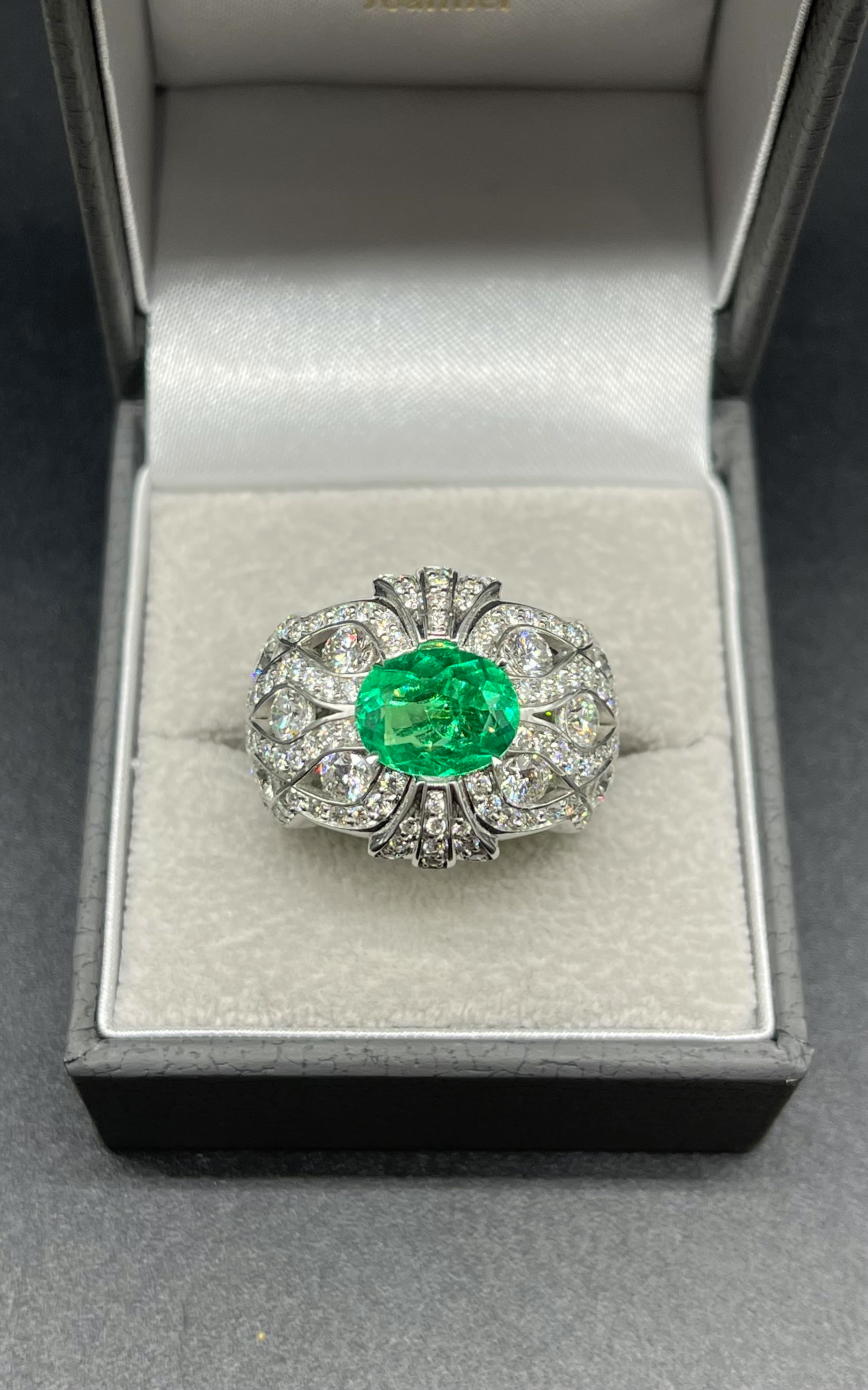 Bague Emeraude de Colombie taille Ovale et Diamants.