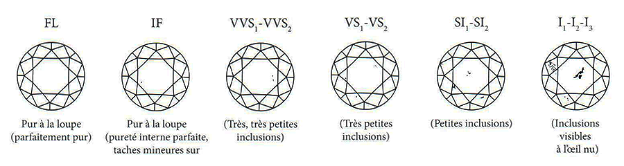 Voici une classification selon le degrés de pureté, établie par le GIA (Gemological Institut Of America).